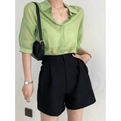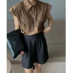 简约小众Polo领垫肩飞飞袖薄款衬衫女设计感褶皱口袋洋气上衣