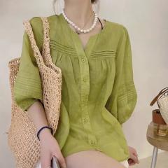 V领蕾丝边灯笼袖天丝衬衫女夏季新款欧货宽松复古小衫上衣
