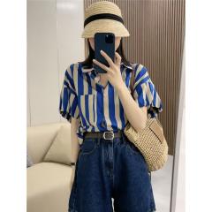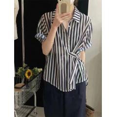 设计感小众短袖雪纺衬衫女夏法式斜扣宽松竖条纹PoLo领别致上衣潮