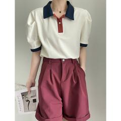 夏翻领POLO袖学院风撞色宽松短袖薄款减龄女针织衫