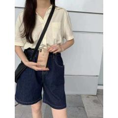 五分牛仔裤夏季薄款宽松显瘦百搭深蓝色高腰阔腿牛仔短裤女