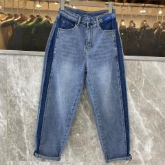 牛仔裤女蓝色深色拼色老爹裤哈伦垮裤
