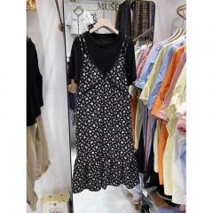 黑色吊带碎花连衣裙两件套女夏欧洲站