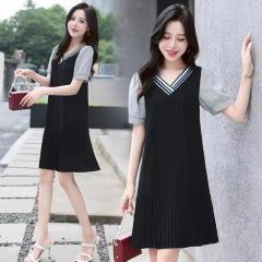 夏季新款韩版宽松小个子时尚休闲v领气质拼接裙