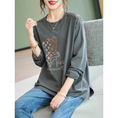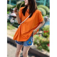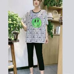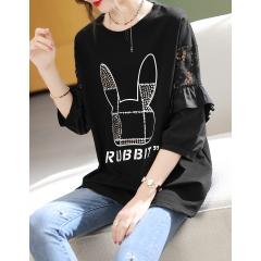 新款蕾丝拼接印花铆钉T恤宽松胖妹妹女装