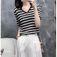 拼色冰丝黑白条纹针织短袖女夏季薄款V领宽松上衣T恤百搭半袖打底