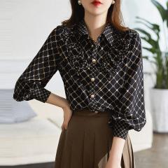 女装优雅蝴蝶结细格纹翻领衬衫