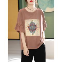 欧洲站大码新款印花钉珠荷叶边短袖T恤宽松胖妹妹女装夏装