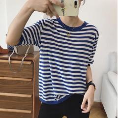 宽松直筒新款条纹chic港味冰丝薄款ins潮圆领女士短袖体恤