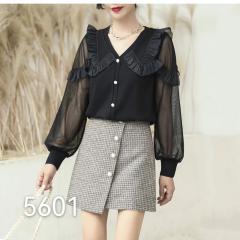 蕾丝纱网V领衬衫木耳边长袖打底显瘦