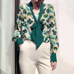飘带雪纺绿碎花衬衫长袖宽松上衣春季款V领气质女