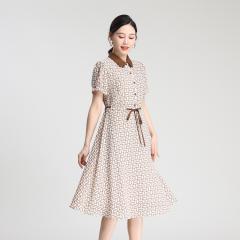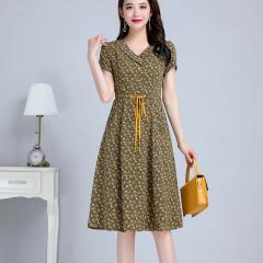 夏装时尚洋气V领系带显瘦碎花雪纺连衣裙