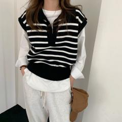 秋季韩系撞色条纹POLO领针织马甲短款背心女无袖马夹上衣潮