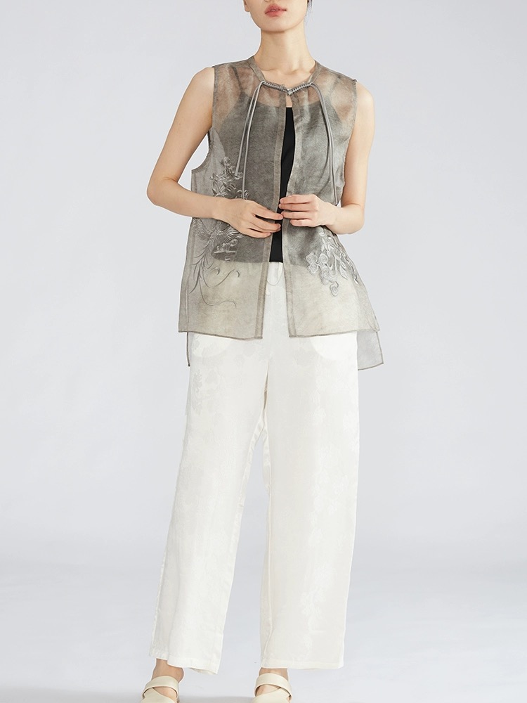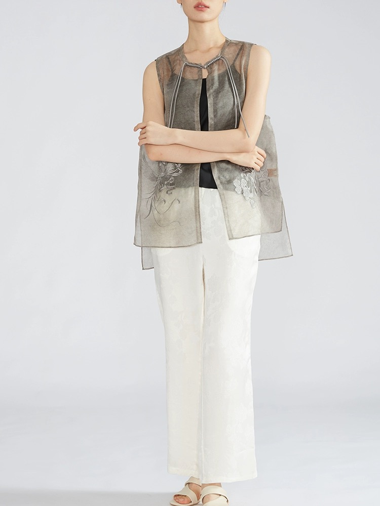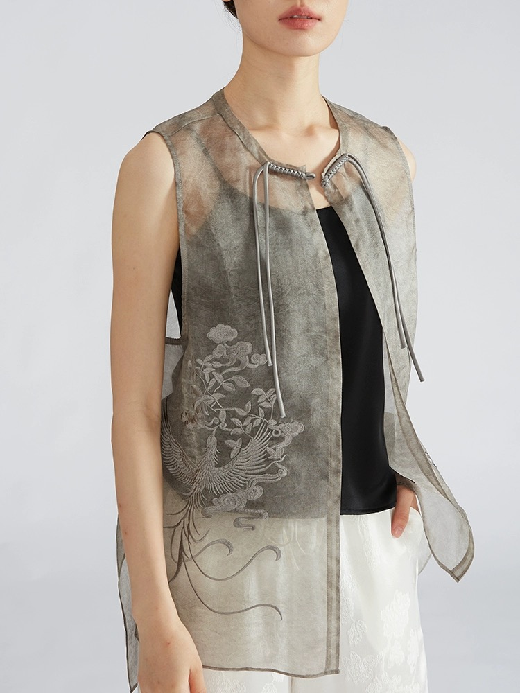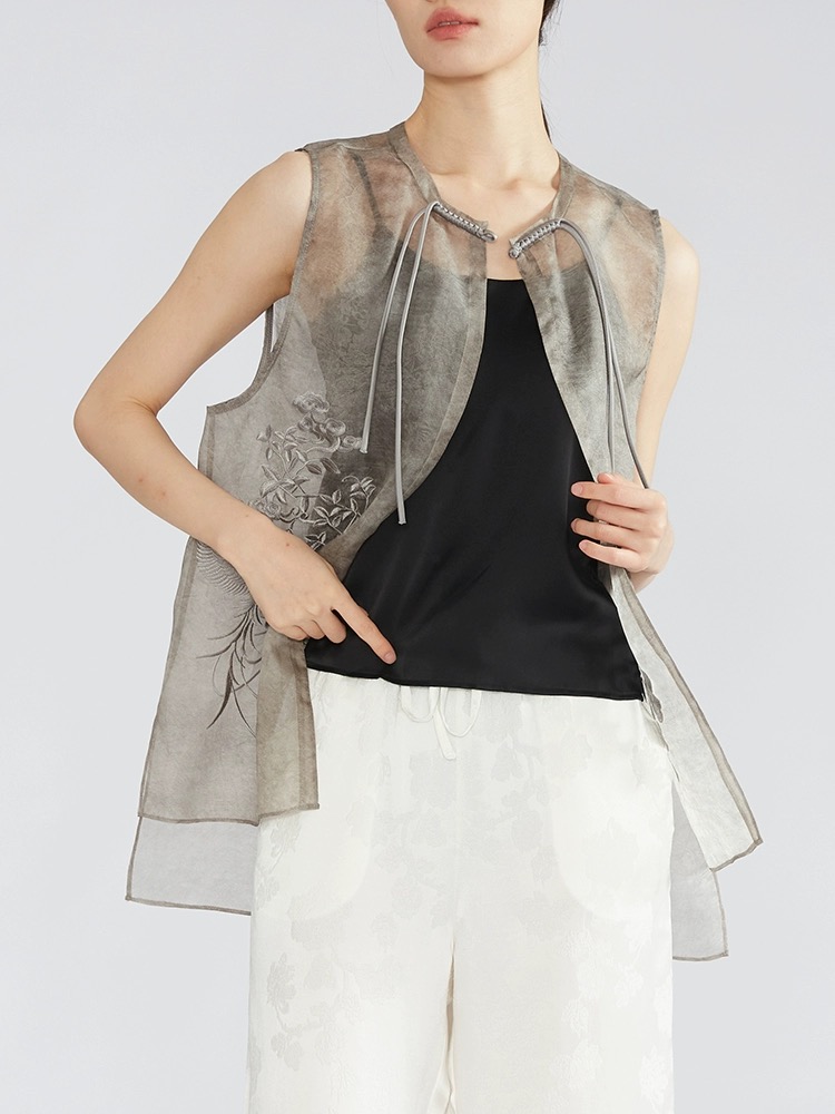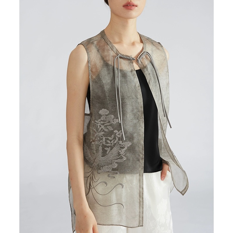 商品名称:草木染桑蚕丝欧根纱马夹新中式真丝绡刺绣马甲