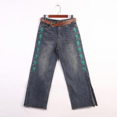 秋季新款刺绣花开叉牛仔裤配皮带
