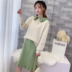 2019甜美可爱套装女新款韩版拼色长袖毛衣荷叶边半身裙洋气两件套