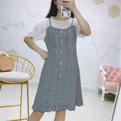 0夏季新款圆领上衣+吊带珍珠扣假两件连衣裙